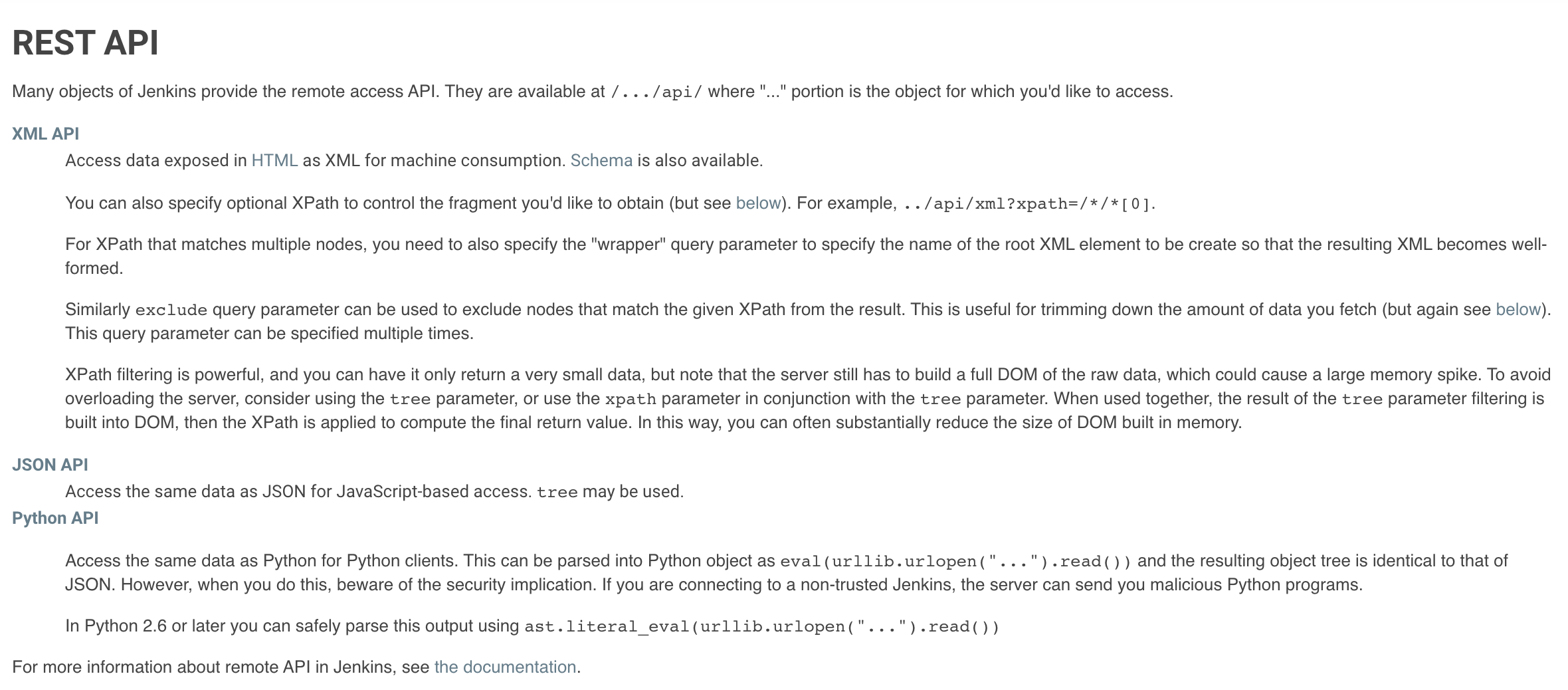 젠킨스 API에 관해서는 젠킨스 주소 뒤에 /api를 붙이면 해당 문서를 볼 수 있는데요, XML, JSON, Python 이 세 가지 형태로 제공한다고 합니다.