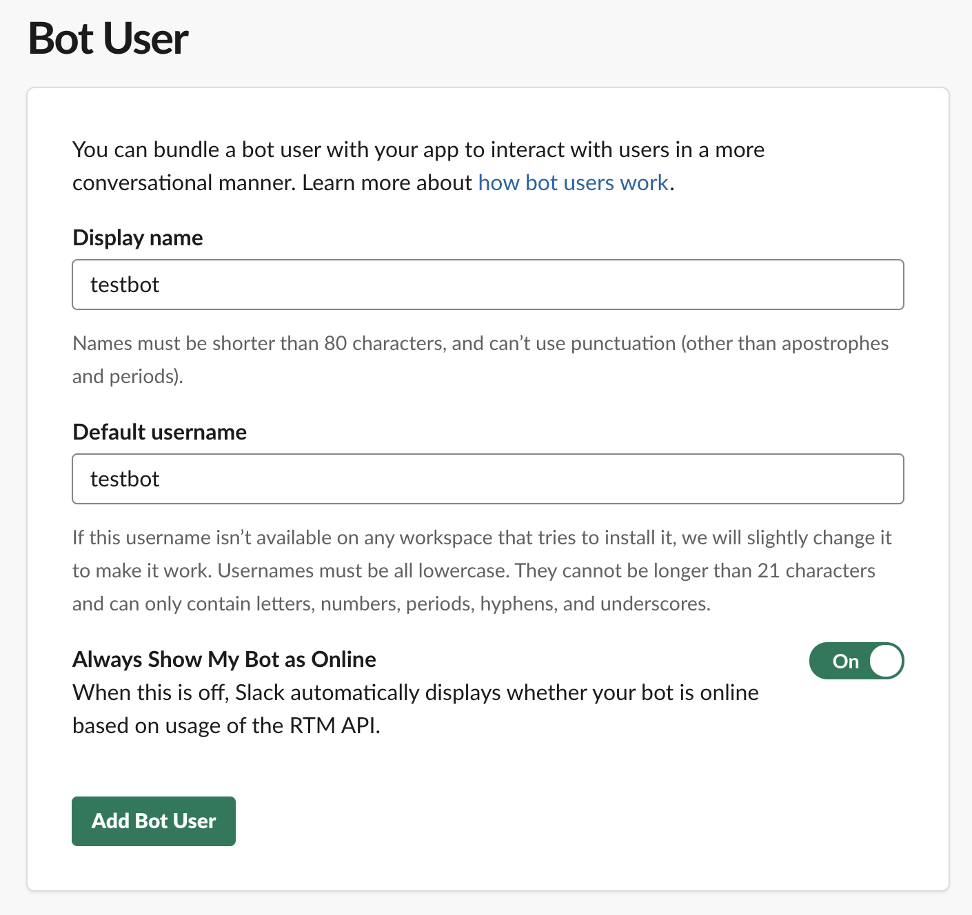 초기 페이지에서는 봇의 대표 이미지와 간단한 설정들을 지정해 줄 수 있습니다. 왼쪽에 Bot User로 가서 Add Bot User를 해줍니다. 이름을 지정할 수 있고, 항상 온라인으로 보여줄 것인지 정할 수 있습니다.
