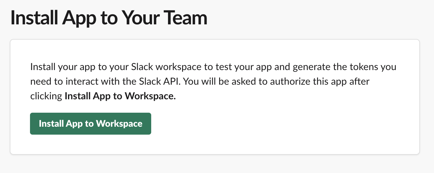 이제 Install App으로 가서 우리의 Workspace에 만든 봇을 설치합니다. 성공적으로 설치가 되면, xoxb로 시작하는 Bot User OAuth Access Token을 보여줍니다. 당연히 유출은 조심하셔야 하고, 사용을 위해 복사해서 잘 가지고 있도록 합시다.