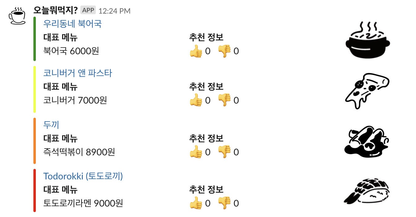 준비된 식당 리스트를 구글 스프레드 시트에 넣어놓고, 서버에서 내용을 주기적으로 긁어와서 슬랙봇 API로 식당 4개 정도를 랜덤으로 뿌려주면 되겠다 싶었습니다. 그리고 어떤 식당에 대한 사용자의 reaction emoji를 받을 수 있다면 추천/비추천 시스템도 만들 수 있을 것 같다 생각했습니다.