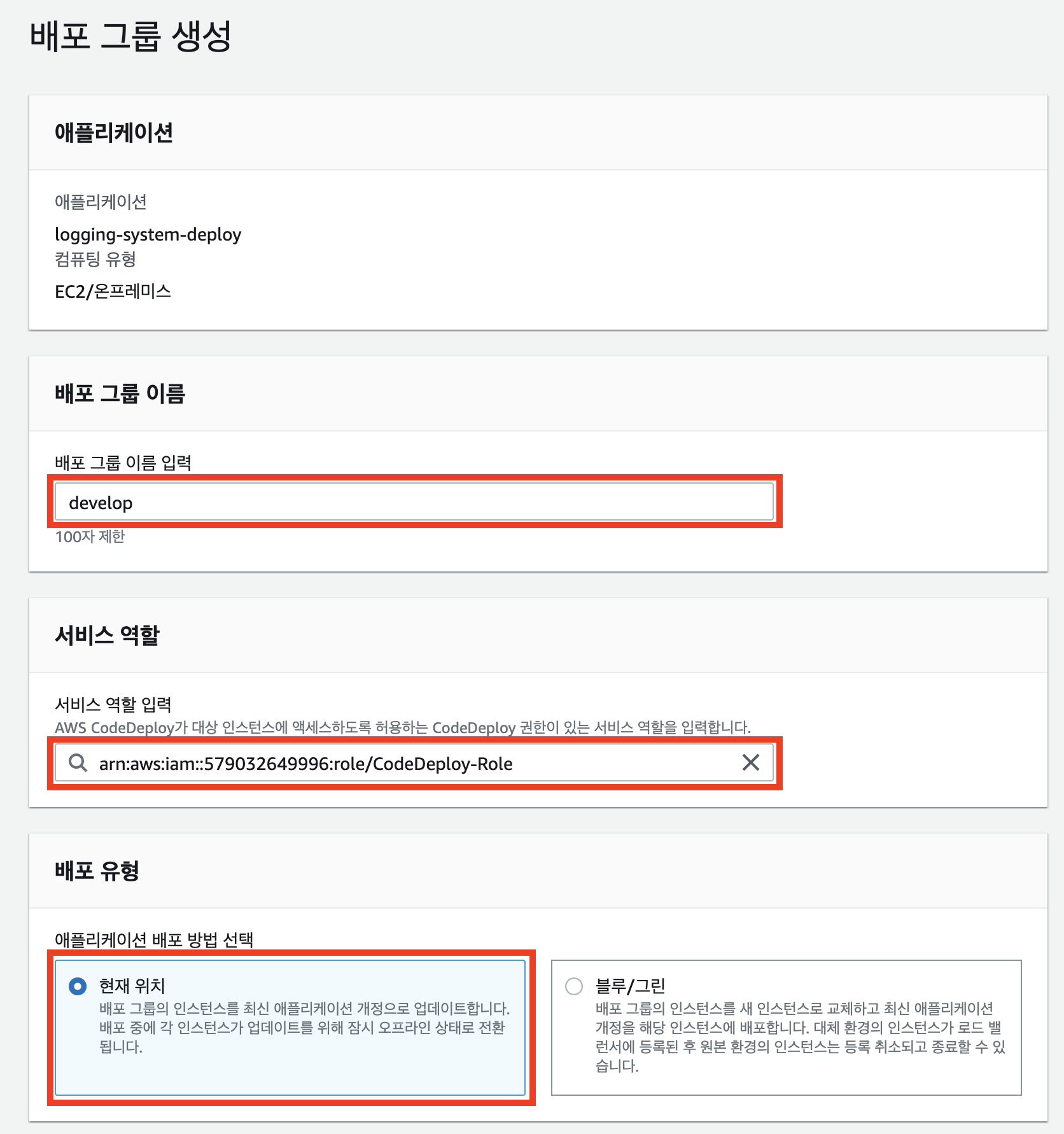 배포 그룹 생성 화면에서 이름과, 방금 만들었던 IAM 역할을 연결합니다.
