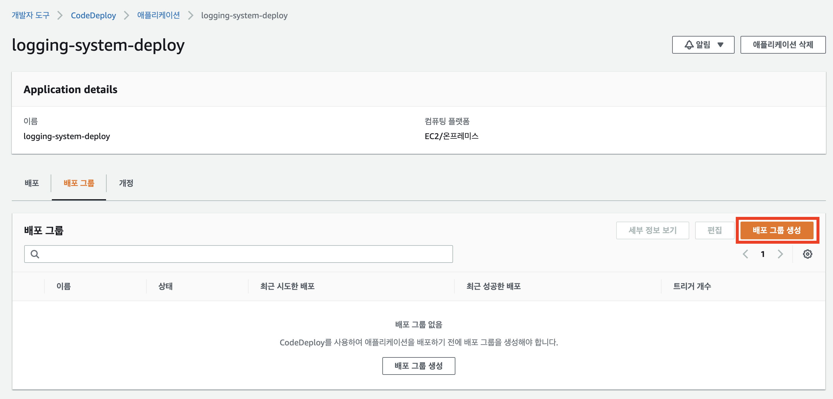 다음으로는 만들어진 애플리케이션에서 배포 그룹 생성을 클릭합니다.