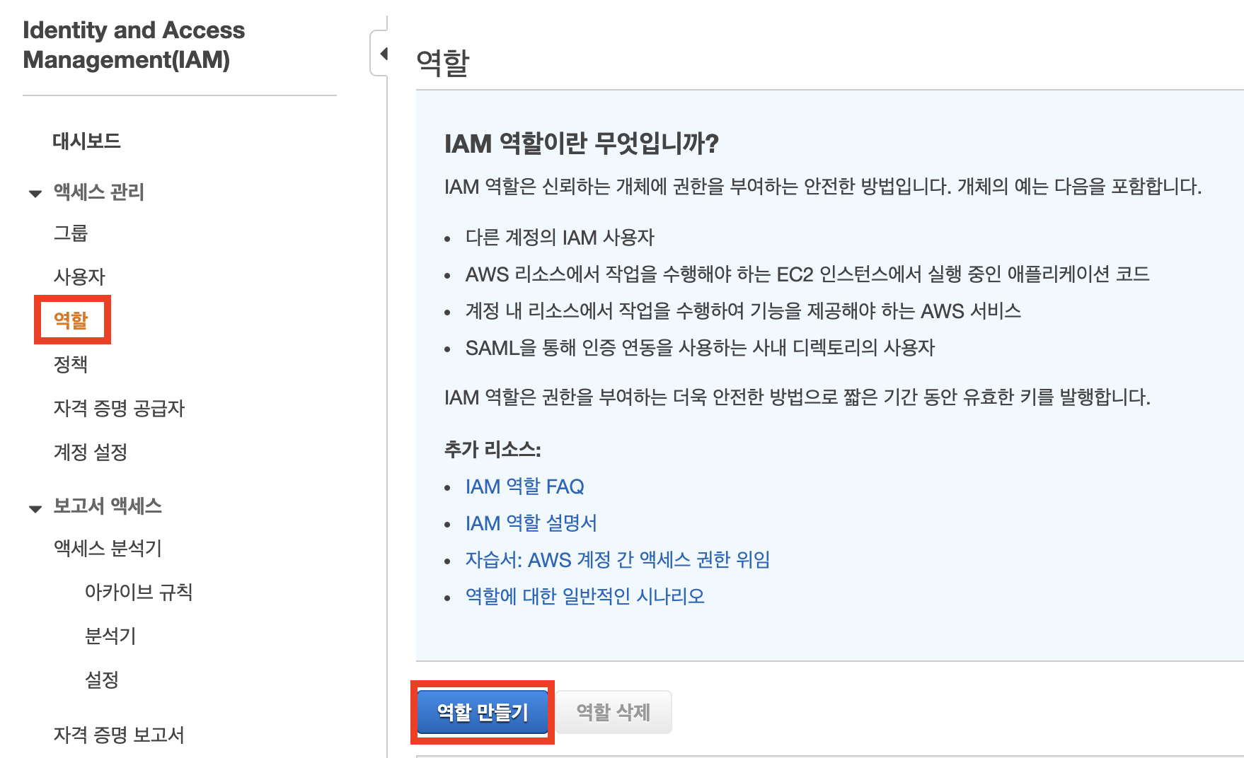 다음과 같이 IAM 의 역할로 이동하여 역할을 만들어 보겠습니다.
