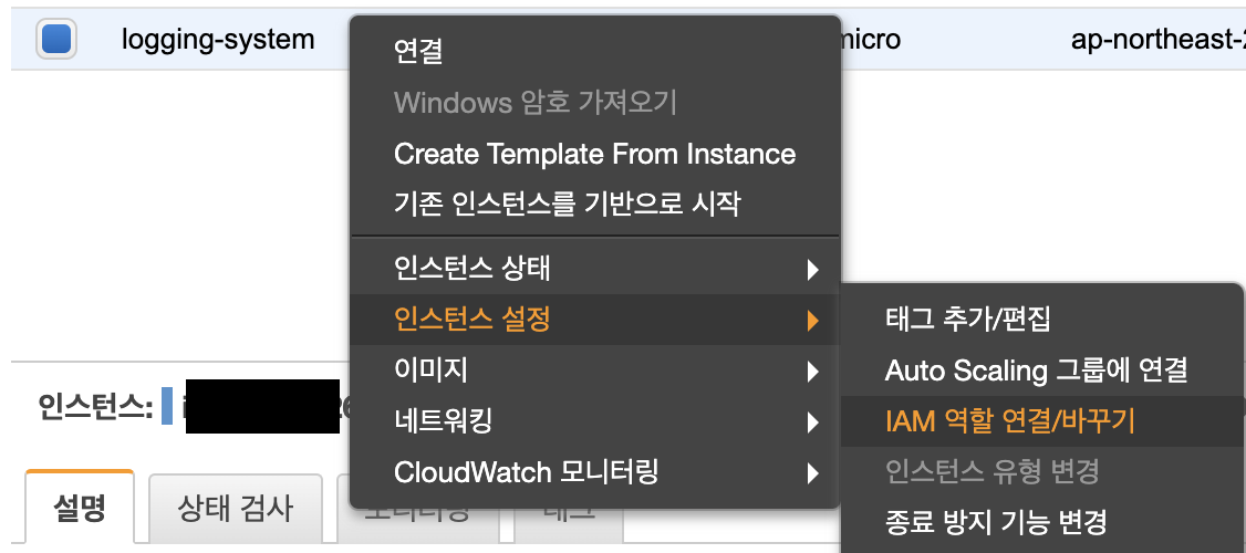역할을 생성했다면 EC2 대시보드로 돌아와 해당 EC2 우클릭 - 인스턴스 설정 - IAM 역할 연결/바꾸기 를 선택합니다.