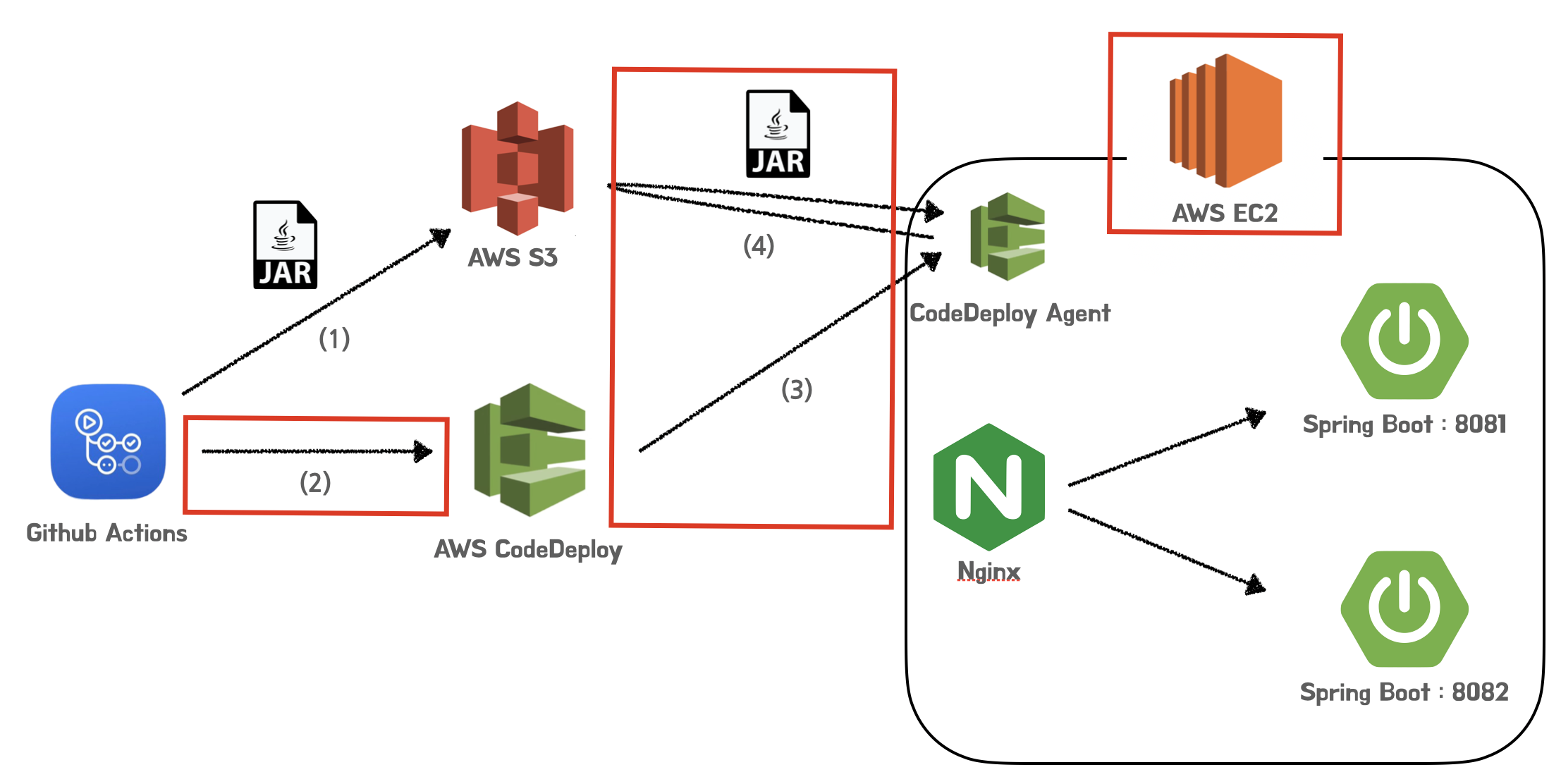 전 시간에 이어 다음으로는 Github Actions 에서 CodeDeploy 에게 S3에 있는 jar 파일을 가져가서 담당한 배포 그룹의 EC2에 배포해 줘! 라는 명령을 내릴 수 있도록 구성해 보겠습니다.