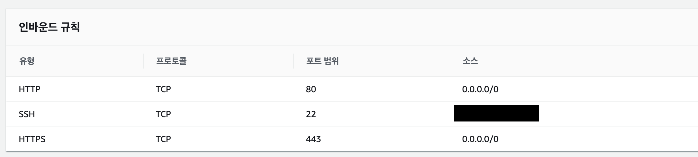 ssh 접속은 현재 내 IP, 그리고 기본적으로 웹 서비스를 할 서버이기 때문에 HTTP, HTTPS 포트인 80, 443 포트에 대해서는 열어주시면 됩니다.