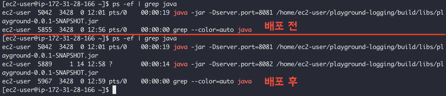 ps -ef | grep java 커맨드를 통해 배포 전과 배포 후를 비교해보면 8082 포트로 새로운 서버가 실행된 것을 볼 수 있습니다.
