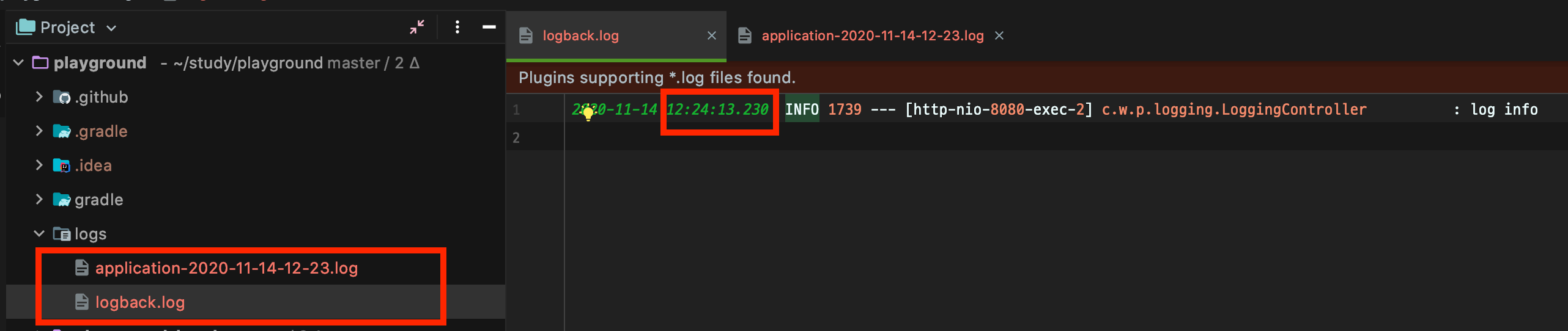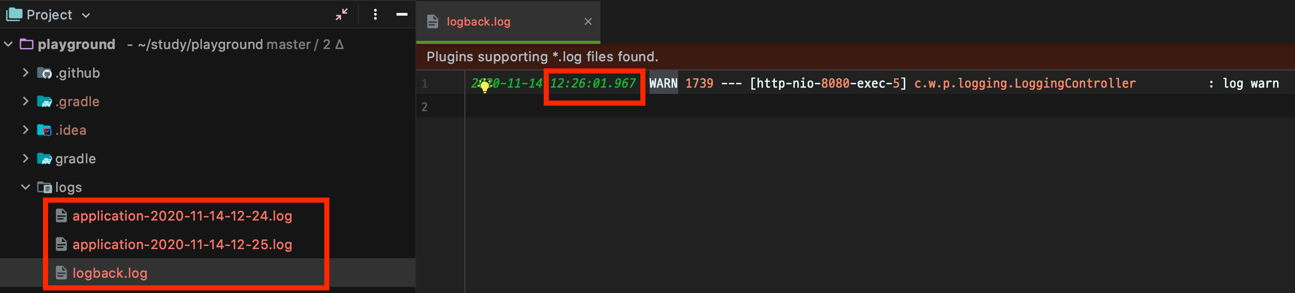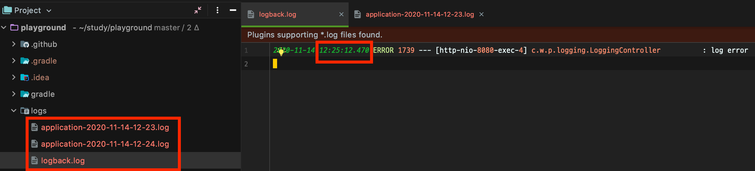 이번에도 방금 전과 같이 24분의 info 로그가 fileNamePattern으로 아카이빙되고, 새로운 25분 error 로그는 logback.log에 쌓인 것을 볼 수 있습니다.