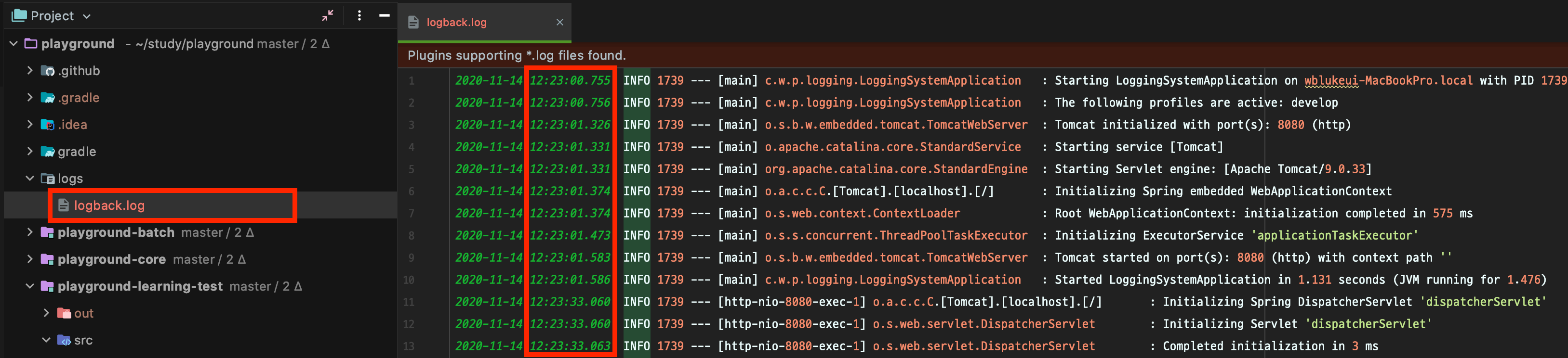 먼저 LOG_PATH로 지정한 logs라는 디렉토리 하위에 logback.log라는 이름으로 서버 실행 로그들이 쌓이는 것을 볼 수 있습니다.